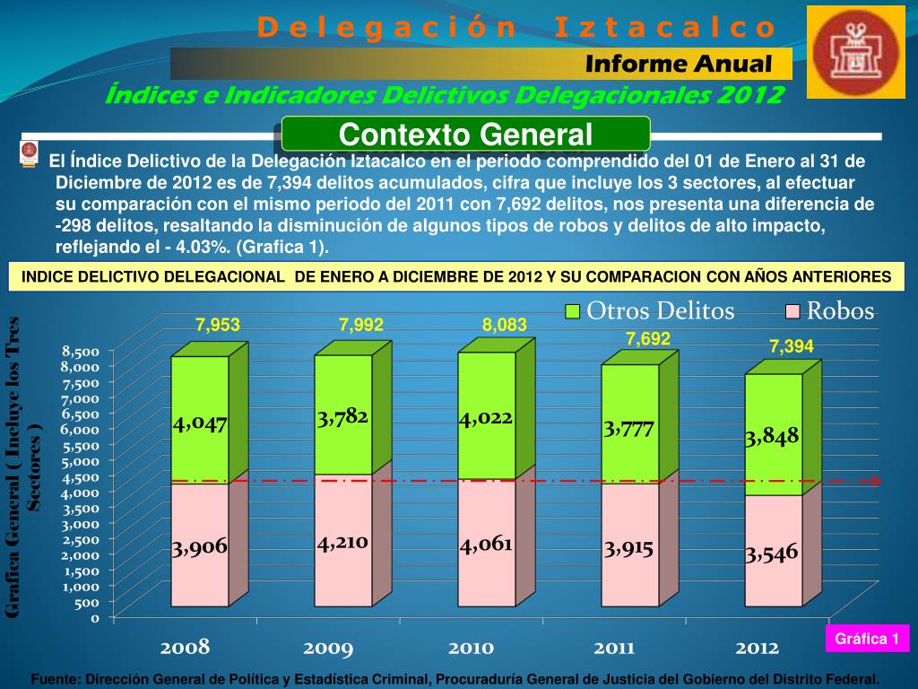 D e l e g a c i ó n I z t a c a l c o Informe Anual Índices e Indicadores Delictivos Delegacionales 2012 Contexto General El Índice Delictivo de la Delegación Iztacalco en el periodo comprendido del 01 de Enero al 31 de Diciembre de 2012 es de 7,394 delitos acumulados, cifra que incluye los 3 sectores, al efectuar su comparación con el mismo periodo del 2011 con 7,692 delitos, nos presenta una diferencia de -298 delitos, resaltando la disminución de algunos tipos de robos y delitos de alto impacto, reflejando el - 4.03%. (Grafica 1). INDICE DELICTIVO DELEGACIONAL DE ENERO A DICIEMBRE DE 2012 Y SU COMPARACION CON AÑOS ANTERIORES INDICE DELICTIVO DELEGACIONAL DE ENERO A DICIEMBRE DE 2012 Y SU COMPARACION CON AÑOS ANTERIORES 7,953 7,992 8,083 7,692 7,394 Grafica General ( Incluye los Tres Sectores ) Gráfica 1 Fuente: Dirección General de Política y Estadística Criminal, Procuraduría General de Justicia del Gobierno del Distrito Federal.