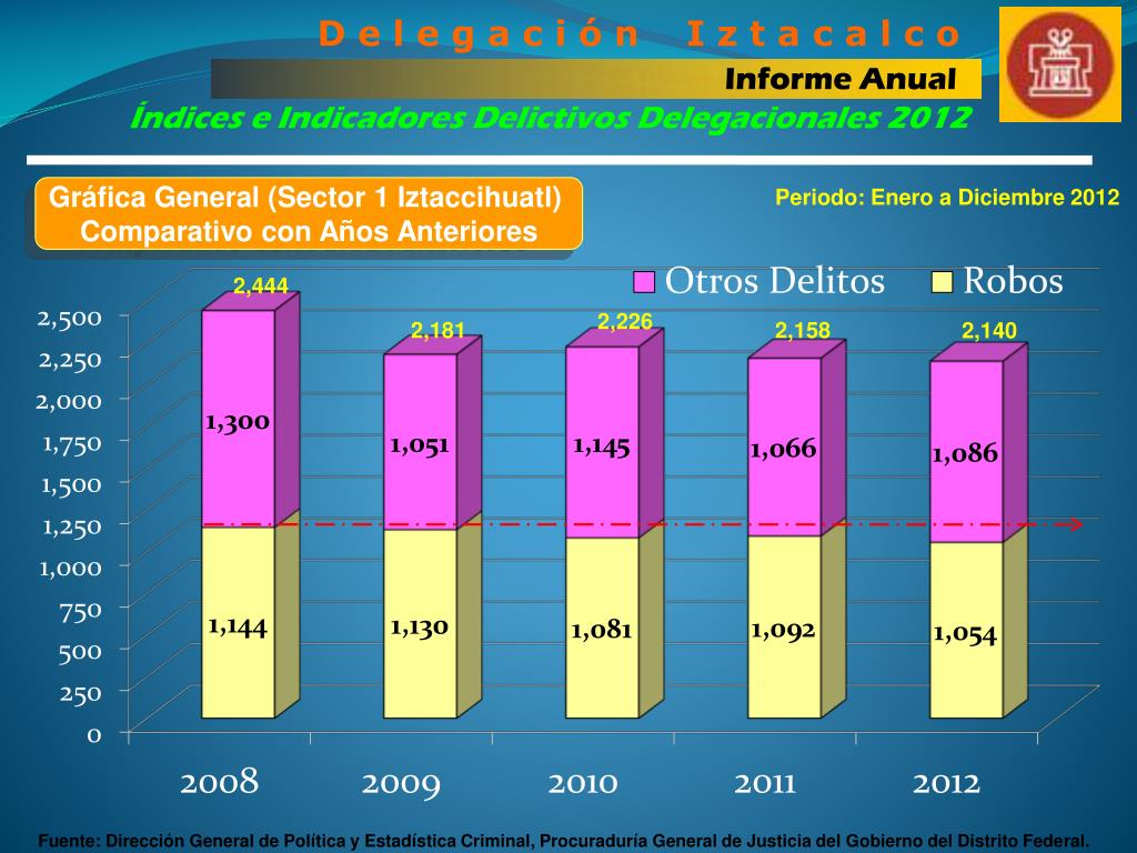 D e l e g a c i ó n I z t a c a l c o Informe Anual Índices e Indicadores Delictivos Delegacionales 2012 Gráfica General (Sector 1 Iztaccihuatl) Comparativo con Años Anteriores Periodo: Enero a Diciembre 2012 2,444 2,226 2,181 2,158 2,140 Fuente: Dirección General de Política y Estadística Criminal, Procuraduría General de Justicia del Gobierno del Distrito Federal.