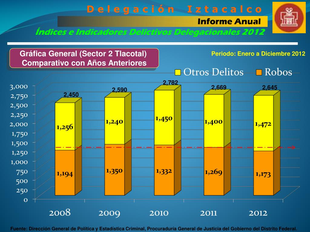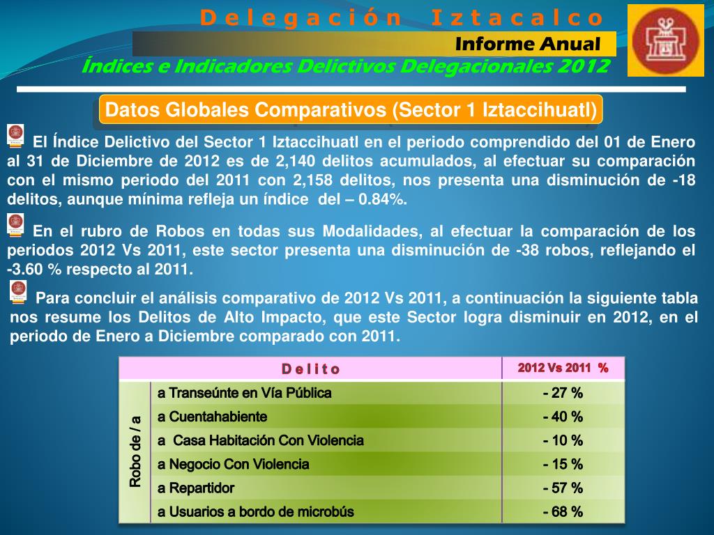 D e l e g a c i ó n I z t a c a l c o Informe Anual Índices e Indicadores Delictivos Delegacionales 2012 Datos Globales Comparativos (Sector 2 Tlacotal) El Índice Delictivo del Sector 2 Tlacotal en el periodo comprendido del 01 de Enero al 31 de Diciembre de 2012 es de 2,645 delitos acumulados, al efectuar su comparación con el mismo periodo del 2011 con 2,669 delitos, nos presenta una disminución de -24 delitos, aunque mínima refleja un índice del – 0.90%. En el rubro de Robos en todas sus Modalidades, al efectuar la comparación de los periodos 2012 Vs 2011, este sector presenta una disminución de -96 robos, reflejando el -8.18 % respecto al 2011. Para concluir el análisis comparativo de 2012 Vs 2011, a continuación la siguiente tabla nos resume los Delitos de Alto Impacto, que este Sector logra disminuir en 2012, en el periodo de Enero a Diciembre comparado con 2011.