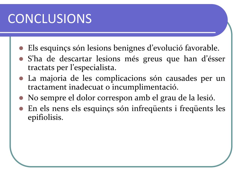 CONCLUSIONS • Els esquinçs són lesions benignes d’evolució favorable. • S’ha de descartar lesions més greus que han d’ésser tractats per l’especialista. • La majoria de les complicacions són causades per un tractament inadecuat o incumplimentació. • No sempre el dolor correspon amb el grau de la lesió. • En els nens els esquinçs són infreqüents i freqüents les epifiolisis.