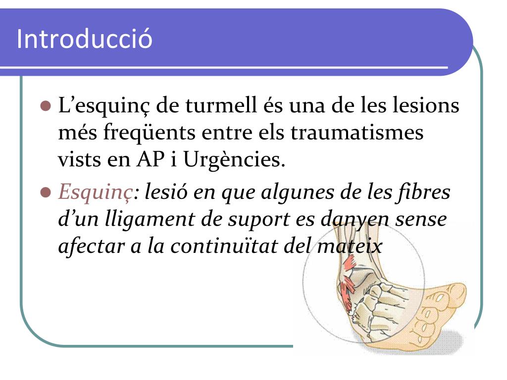 Introducció • L’esquinç de turmell és una de les lesions més freqüents entre els traumatismes vists en AP i Urgències. • Esquinç: lesió en que algunes de les fibres d’un lligament de suport es danyen sense afectar a la continuïtat del mateix