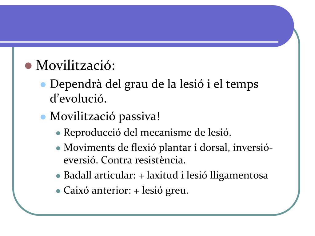 Movilització: • Dependrà del grau de la lesió i el temps d’evolució. • Movilització passiva! • Reproducció del mecanisme de lesió. • Moviments de flexió plantar i dorsal, inversió-eversió. Contra resistència. • Badall articular: + laxitud i lesió lligamentosa • Caixó anterior: + lesió greu.