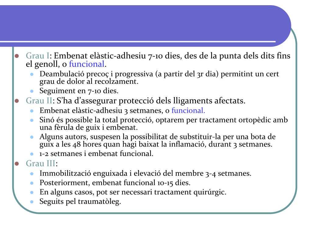 Grau I: Embenat elàstic-adhesiu 7-10 dies, des de la punta dels dits fins el genoll, o funcional. • Deambulació precoç i progressiva (a partir del 3r dia) permitint un cert grau de dolor al recolzament. • Seguiment en 7-10 dies. • Grau II: S’ha d’assegurar protecció dels lligaments afectats. • Embenat elàstic-adhesiu 3 setmanes, o funcional. • Sinó és possible la total protecció, optarem per tractament ortopèdic amb una fèrula de guix i embenat. • Alguns autors, suspesen la possibilitat de substituir-la per una bota de guix a les 48 hores quan hagi baixat la inflamació, durant 3 setmanes. • 1-2 setmanes i embenat funcional. • Grau III: • Immobilització enguixada i elevació del membre 3-4 setmanes. • Posteriorment, embenat funcional 10-15 dies. • En alguns casos, pot ser necessari tractament quirúrgic. • Seguits pel traumatòleg.