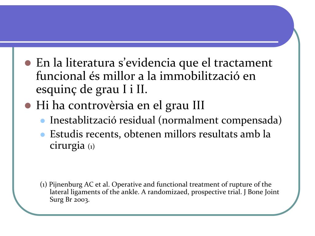 En la literatura s’evidencia que el tractament funcional és millor a la immobilització en esquinç de grau I i II. • Hi ha controvèrsia en el grau III • Inestablització residual (normalment compensada) • Estudis recents, obtenen millors resultats amb la cirurgia (1) (1) Pijnenburg AC et al. Operative and functional treatment of rupture of the lateral ligaments of the ankle. A randomizaed, prospective trial. J Bone Joint Surg Br 2003.