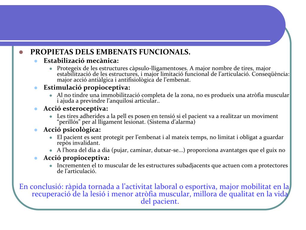 PROPIETAS DELS EMBENATS FUNCIONALS. • Estabilizació mecànica: • Protegeix de les estructures càpsulo-lligamentoses. A major nombre de tires, major estabilització de les estructures, i major limitació funcional de l’articulació. Conseqüència: major acció antiàlgica i antifisiològica de l’embenat. • Estimulació propioceptiva: • Al no tindre una immobilització completa de la zona, no es produeix una atròfia muscular i ajuda a previndre l’anquilosi articular.. • Acció esteroceptiva: • Les tires adherides a la pell es posen en tensió si el pacient va a realitzar un moviment “perillós” per al lligament lesionat. (Sistema d’alarma) • Acció psicològica: • El pacient es sent protegit per l’embenat i al mateix temps, no limitat i obligat a guardar repòs invalidant. • A l’hora del dia a dia (pujar, caminar, dutxar-se...) proporciona avantatges que el guix no • Acció propioceptiva: • Incrementen el to muscular de les estructures subadjacents que actuen com a protectores de l’articulació. En conclusió: ràpida tornada a l’activitat laboral o esportiva, major mobilitat en la recuperació de la lesió i menor atròfia muscular, millora de qualitat en la vida del pacient.