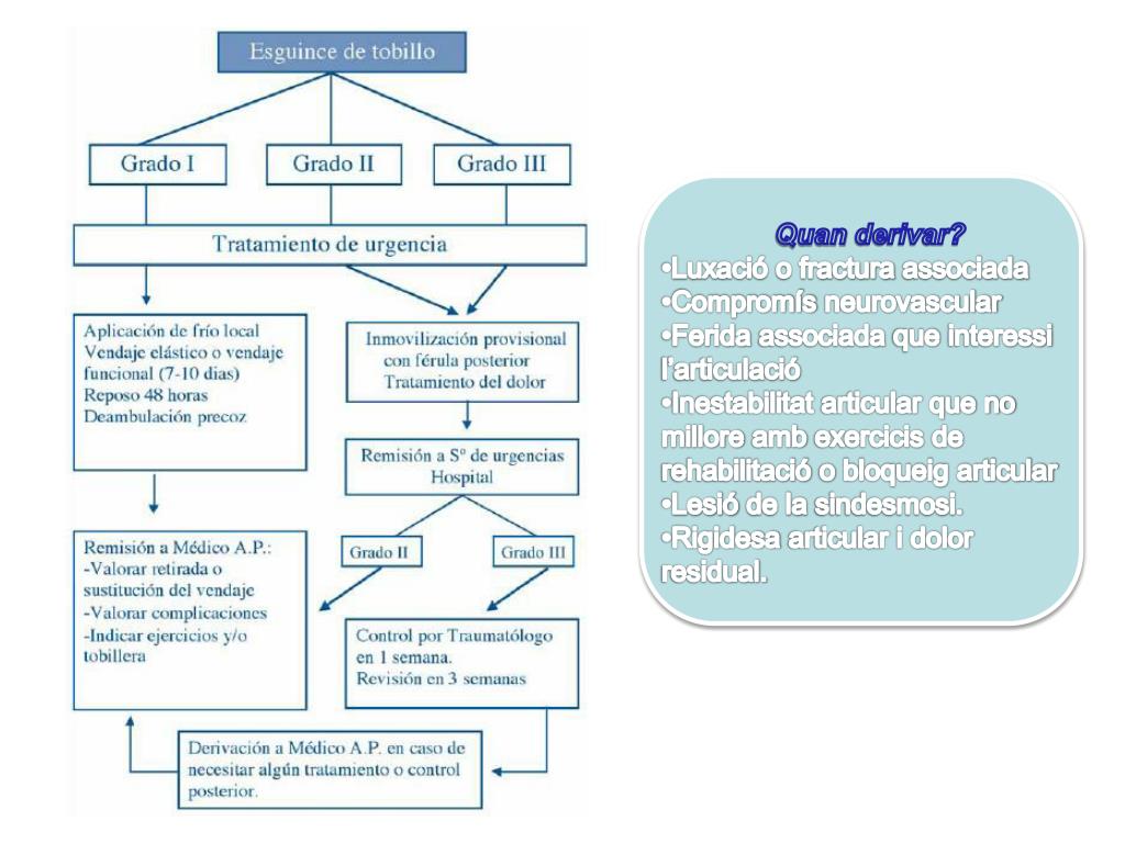 Quan derivar? • Luxació o fractura associada • Compromísneurovascular • Feridaassociada que interessil’articulació • Inestabilitat articular que no milloreambexercicis de rehabilitació o bloqueig articular • Lesió de la sindesmosi. • Rigidesa articular i dolor residual.