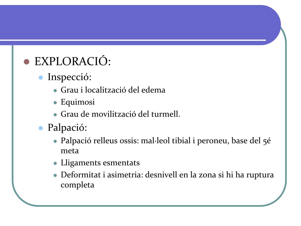 EXPLORACIÓ: • Inspecció: • Grau i localització del edema • Equimosi • Grau de movilització del turmell. • Palpació: • Palpació relleus ossis: mal·leol tibial i peroneu, base del 5é meta • Lligaments esmentats • Deformitat i asimetria: desnivell en la zona si hi ha ruptura completa