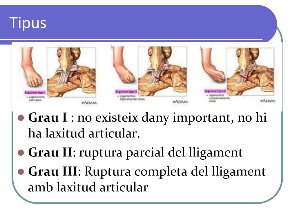 Tipus . • Grau I : no existeix dany important, no hi ha laxitud articular. • Grau II: ruptura parcial del lligament • Grau III: Ruptura completa del lligament amb laxitud articular