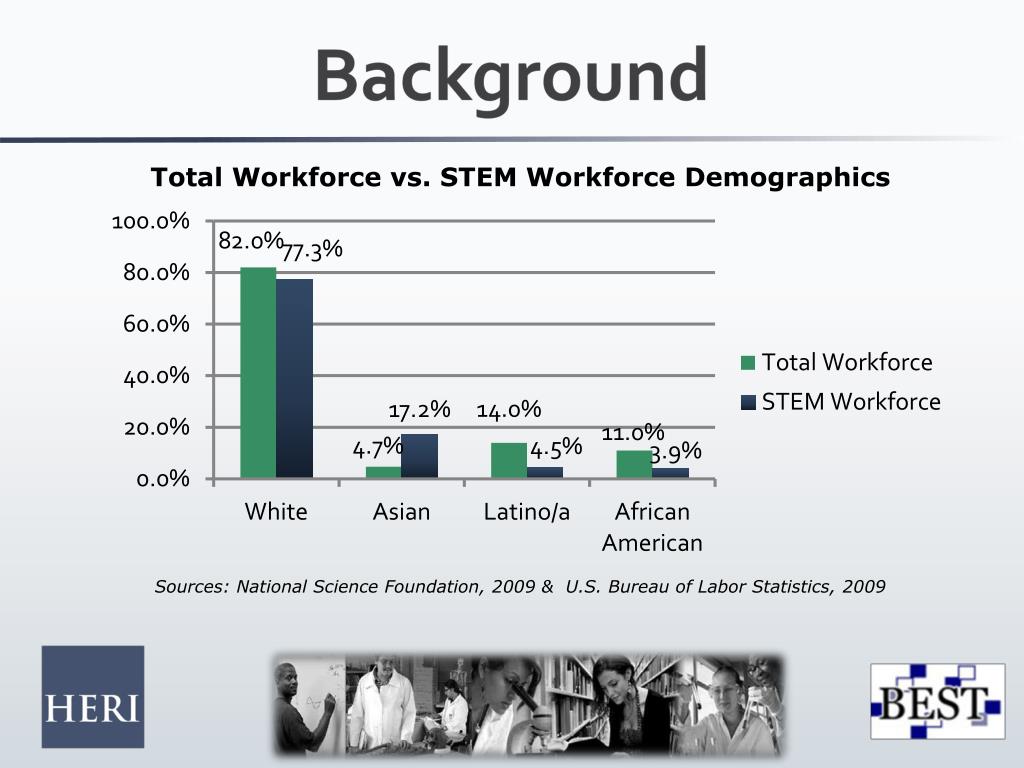 Background Total Workforce vs. STEM Workforce Demographics Sources: National Science Foundation, 2009 & U.S. Bureau of Labor Statistics, 2009