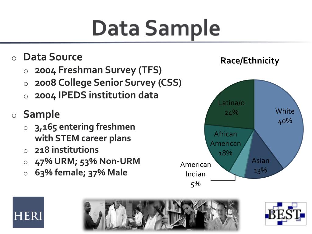 Data Sample • Data Source • 2004 Freshman Survey (TFS) • 2008 College Senior Survey (CSS) • 2004 IPEDS institution data • Sample • 3,165 entering freshmen with STEM career plans • 218 institutions • 47% URM; 53% Non-URM • 63% female; 37% Male