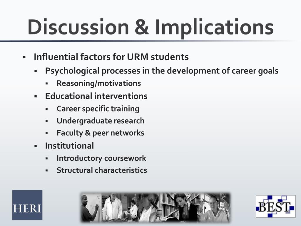 Discussion & Implications • Influential factors for URM students • Psychological processes in the development of career goals • Reasoning/motivations • Educational interventions • Career specific training • Undergraduate research • Faculty & peer networks • Institutional • Introductory coursework • Structural characteristics