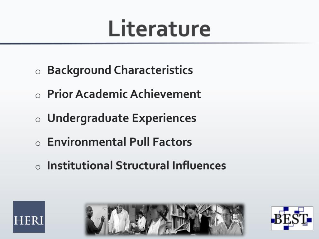 Literature • Background Characteristics • Prior Academic Achievement • Undergraduate Experiences • Environmental Pull Factors • Institutional Structural Influences