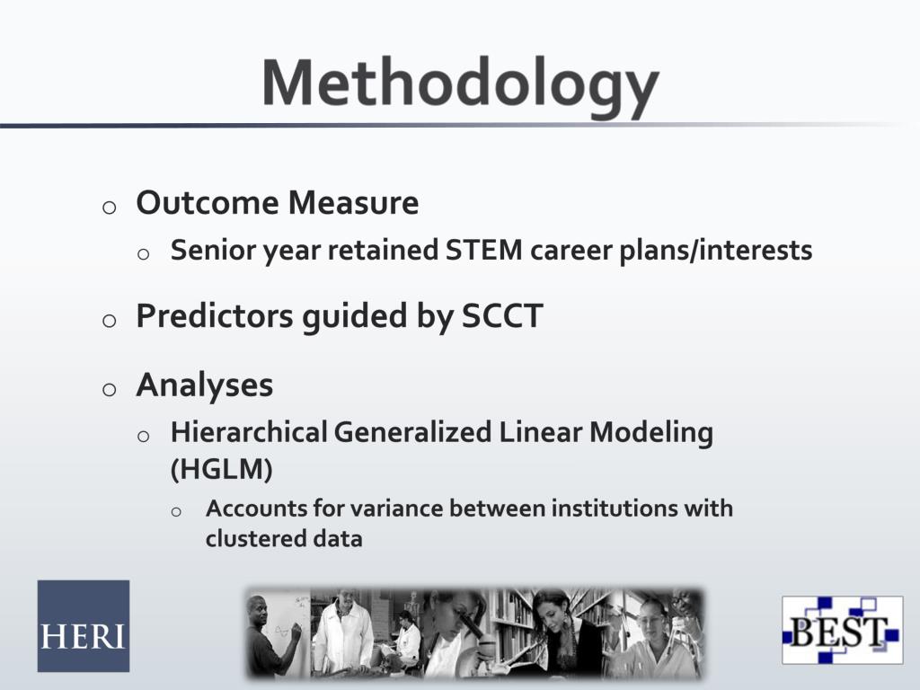 Methodology • Outcome Measure • Senior year retained STEM career plans/interests • Predictors guided by SCCT • Analyses • Hierarchical Generalized Linear Modeling (HGLM) • Accounts for variance between institutions with clustered data
