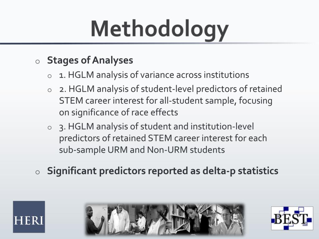 Methodology • Stages of Analyses • 1. HGLM analysis of variance across institutions • 2. HGLM analysis of student-level predictors of retained STEM career interest for all-student sample, focusing on significance of race effects • 3. HGLM analysis of student and institution-level predictors of retained STEM career interest for each sub-sample URM and Non-URM students • Significant predictors reported as delta-p statistics