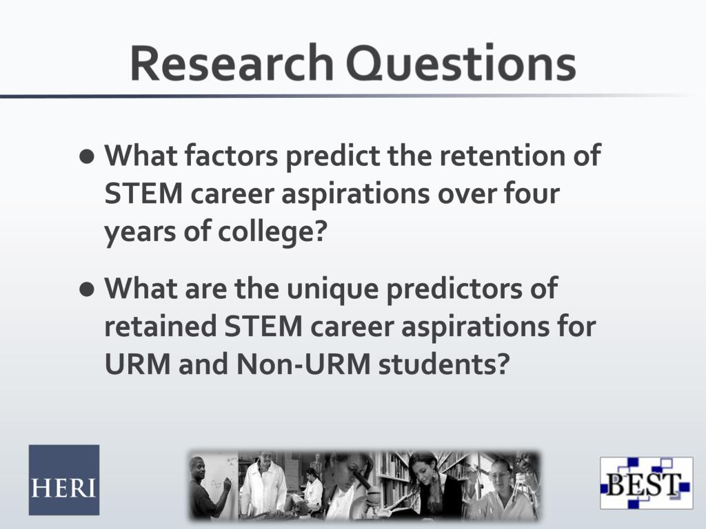 Research Questions • What factors predict the retention of STEM career aspirations over four years of college? • What are the unique predictors of retained STEM career aspirations for URM and Non-URM students?