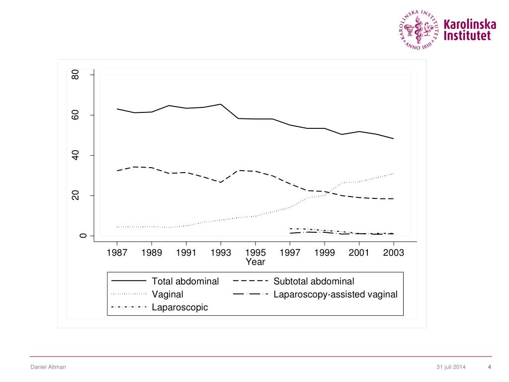 Sammanfattningsvis • Hysterektomi är ett säkert och effektivt behandlingsalternativ för ett flertal benigna gynekologiska sjukdomstillstånd • Risken för allvarliga perioperativa komplikationer är mycket låg • Långtidseffekter är ännu bristfälligt kartlagda men en överrisk för inkontinens, prolaps och fistelsjukdom efter hysterektomi måste beaktas Daniel Altman