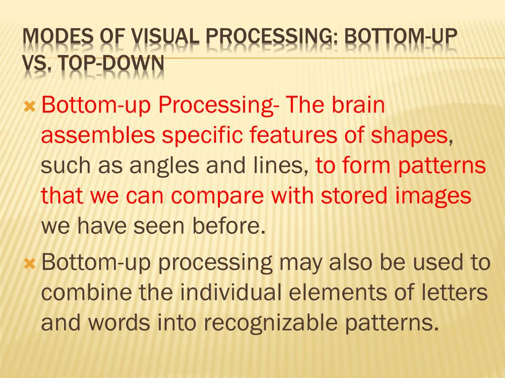 Bottom-up Processing- The brain assembles specific features of shapes, such as angles and lines, to form patterns that we can compare with stored images we have seen before. Bottom-up processing may also be used to combine the individual elements of letters and words into recognizable patterns. Modes of Visual Processing: Bottom-Up Vs. Top-Down