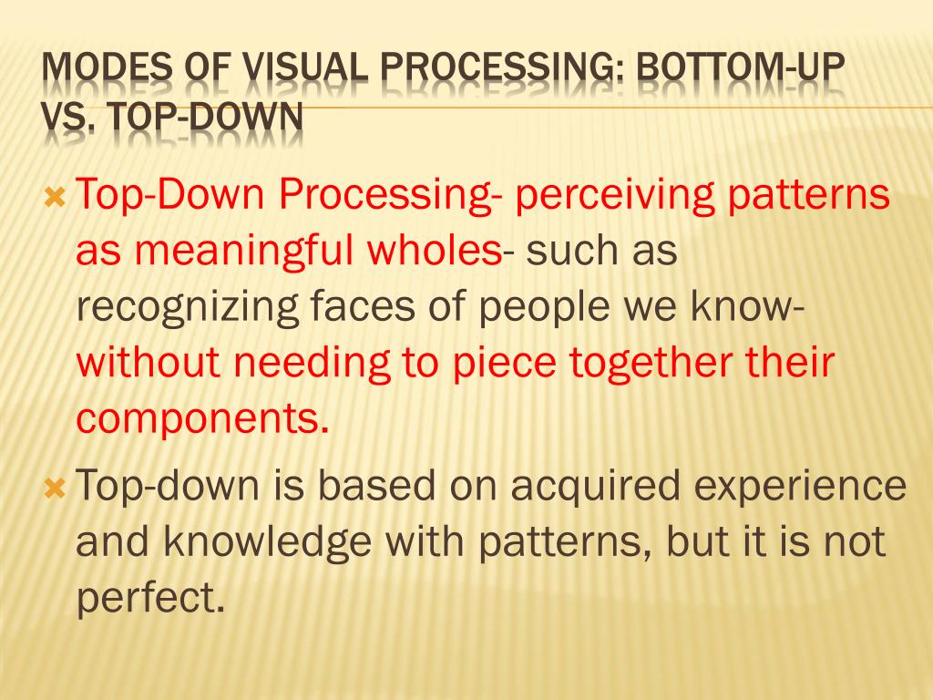 Top-Down Processing- perceiving patterns as meaningful wholes- such as recognizing faces of people we know- without needing to piece together their components. Top-down is based on acquired experience and knowledge with patterns, but it is not perfect. Modes of Visual Processing: Bottom-Up Vs. Top-Down