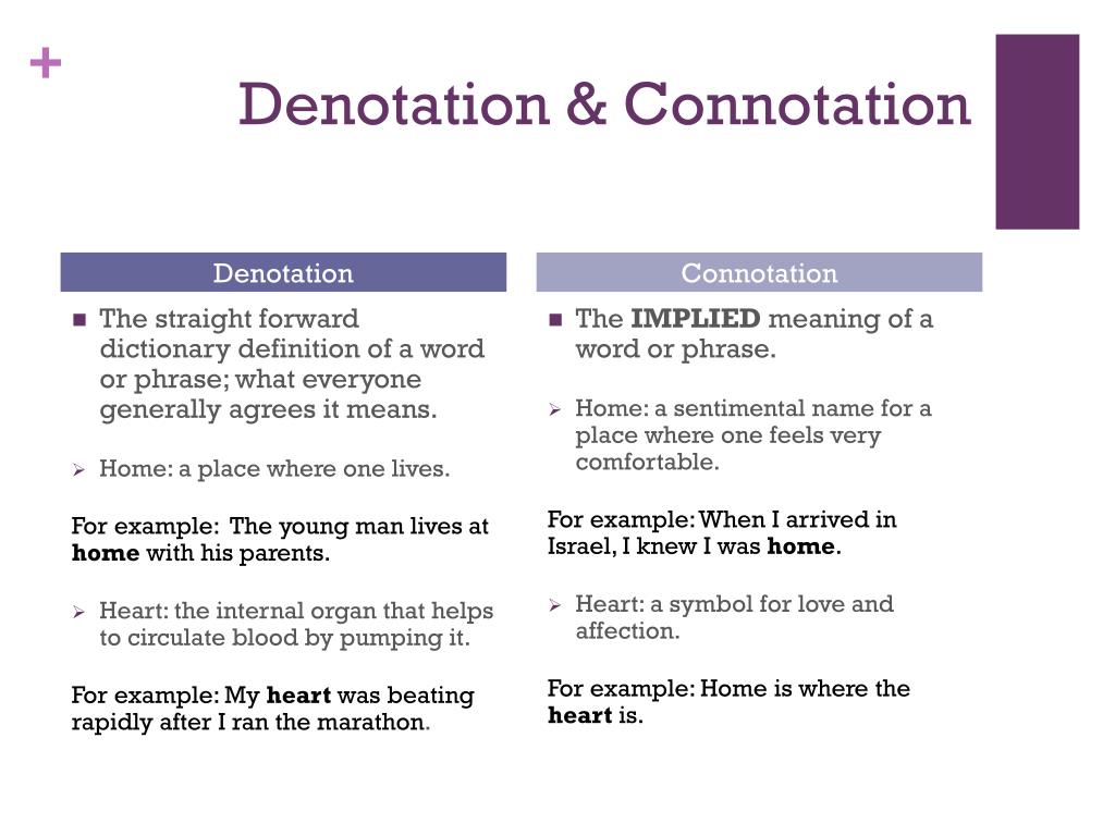 Denotation & Connotation Denotation Connotation • The straight forward dictionary definition of a word or phrase; what everyone generally agrees it means. • Home: a place where one lives. For example: The young man lives at home with his parents. • Heart: the internal organ that helps to circulate blood by pumping it. For example: My heart was beating rapidly after I ran the marathon. • The IMPLIED meaning of a word or phrase. • Home: a sentimental name for a place where one feels very comfortable. For example: When I arrived in Israel, I knew I was home. • Heart: a symbol for love and affection. For example: Home is where the heart is.