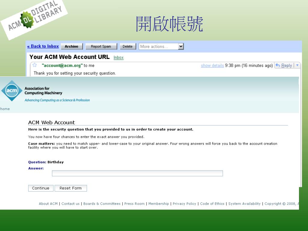 課程大綱 • 1.資料庫簡介 • 2.資料庫使用功能_瀏覽 • 3.資料庫使用功能_檢索 (QuickSearch + Refine) • 4.資料庫使用功能_檢索 (Advanced Search ) • 5.作者專區 • 6.個人化功能 • 7.Computing Reviews搭配使用