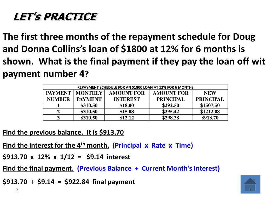 LET’s PRACTICE The first three months of the repayment schedule for Doug and Donna Collins’s loan of $1800 at 12% for 6 months is shown. What is the final payment if they pay the loan off with payment number 4? Find the previous balance. It is $913.70 Find the interest for the 4th month.(Principal x Rate x Time) $913.70 x 12% x 1/12 = $9.14 interest Find the final payment.(Previous Balance + Current Month’s Interest) $913.70 + $9.14 = $922.84 final payment