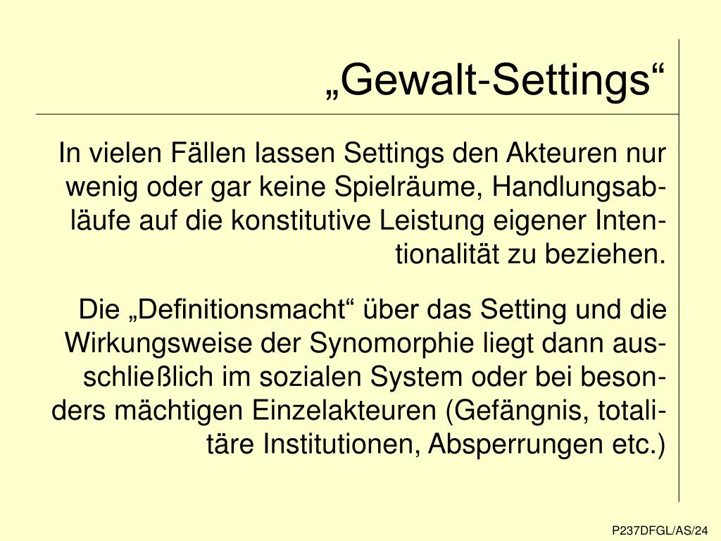 „Gewalt-Settings“ In vielen Fällen lassen Settings den Akteuren nur wenig oder gar keine Spielräume, Handlungsab- läufe auf die konstitutive Leistung eigener Inten- tionalität zu beziehen. Die „Definitionsmacht“ über das Setting und die Wirkungsweise der Synomorphie liegt dann aus- schließlich im sozialen System oder bei beson- ders mächtigen Einzelakteuren (Gefängnis, totali- täre Institutionen, Absperrungen etc.) P237DFGL/AS/24