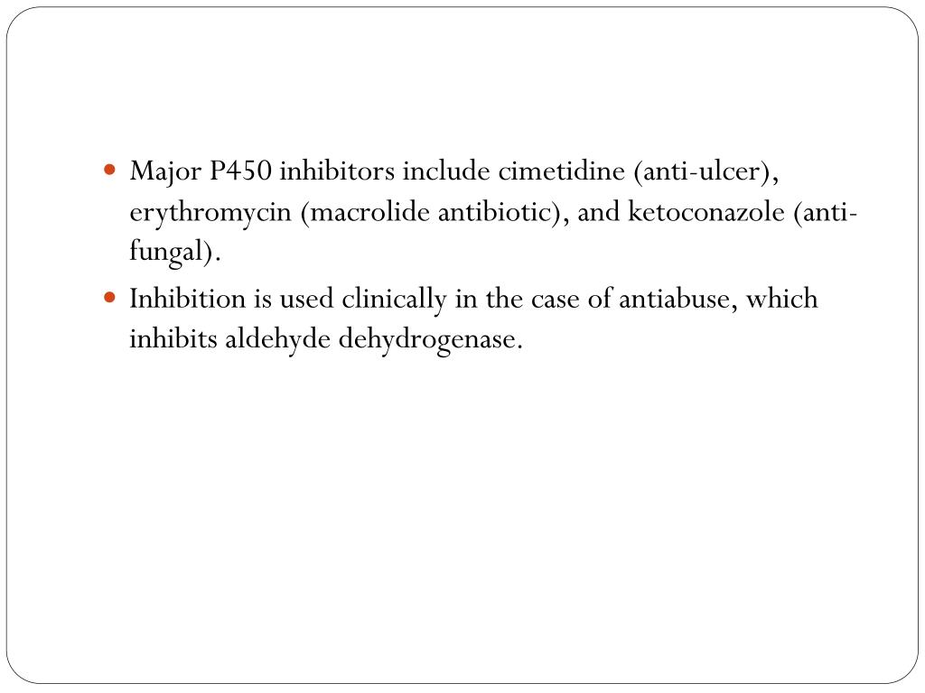Major P450 inhibitors include cimetidine (anti-ulcer), erythromycin (macrolide antibiotic), and ketoconazole (anti-fungal). • Inhibition is used clinically in the case of antiabuse, which inhibits aldehyde dehydrogenase.