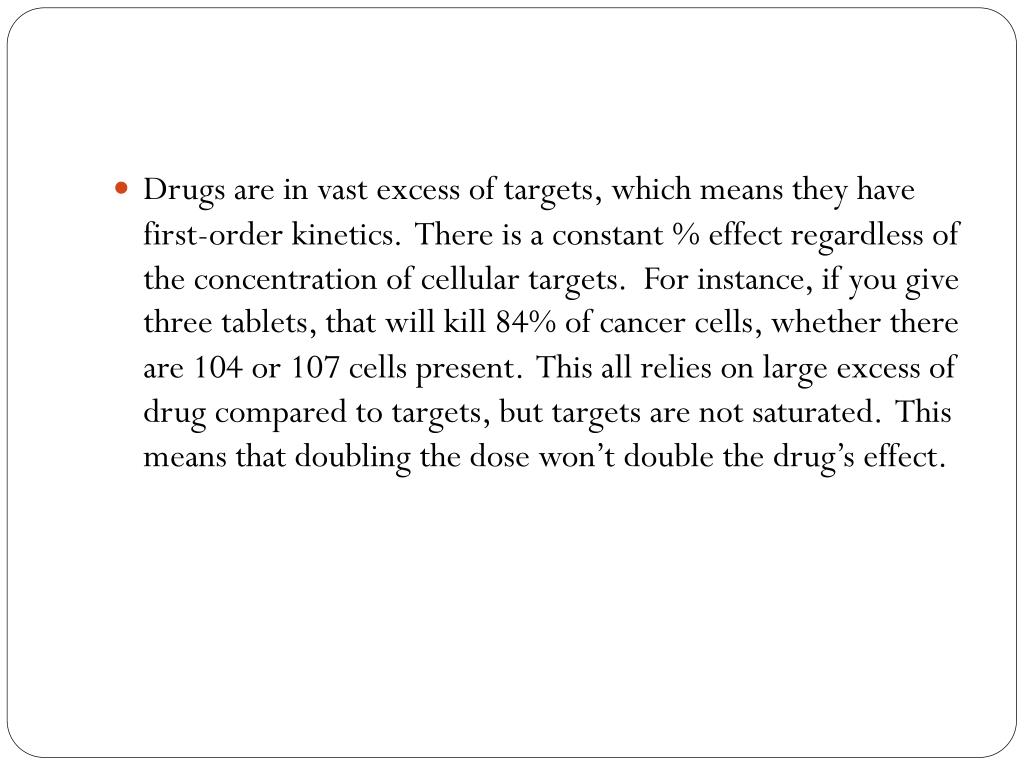 Drugs are in vast excess of targets, which means they have first-order kinetics. There is a constant % effect regardless of the concentration of cellular targets. For instance, if you give three tablets, that will kill 84% of cancer cells, whether there are 104 or 107 cells present. This all relies on large excess of drug compared to targets, but targets are not saturated. This means that doubling the dose won’t double the drug’s effect.