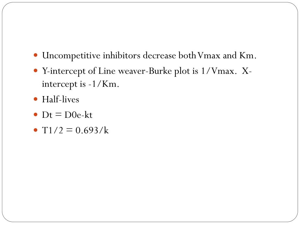 Uncompetitive inhibitors decrease both Vmax and Km. • Y-intercept of Line weaver-Burke plot is 1/Vmax. X-intercept is -1/Km. • Half-lives • Dt = D0e-kt • T1/2 = 0.693/k