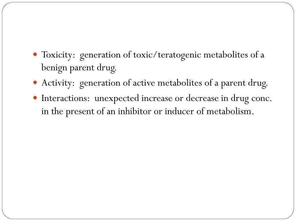 Toxicity: generation of toxic/teratogenic metabolites of a benign parent drug. • Activity: generation of active metabolites of a parent drug. • Interactions: unexpected increase or decrease in drug conc. in the present of an inhibitor or inducer of metabolism.