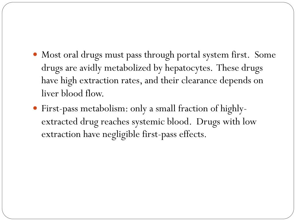 Most oral drugs must pass through portal system first. Some drugs are avidly metabolized by hepatocytes. These drugs have high extraction rates, and their clearance depends on liver blood flow. • First-pass metabolism: only a small fraction of highly-extracted drug reaches systemic blood. Drugs with low extraction have negligible first-pass effects.