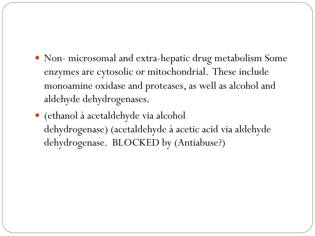 Non- microsomal and extra-hepatic drug metabolism Some enzymes are cytosolic or mitochondrial. These include monoamine oxidase and proteases, as well as alcohol and aldehyde dehydrogenases. • (ethanol à acetaldehyde via alcohol dehydrogenase) (acetaldehyde à acetic acid via aldehyde dehydrogenase. BLOCKED by (Antiabuse?)