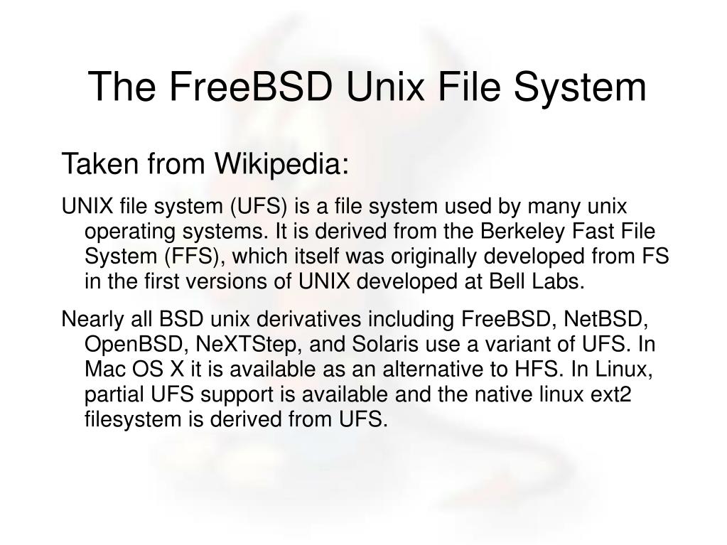 The FreeBSD Unix File System Taken from Wikipedia: UNIX file system (UFS) is a file system used by many unix operating systems. It is derived from the Berkeley Fast File System (FFS), which itself was originally developed from FS in the first versions of UNIX developed at Bell Labs. Nearly all BSD unix derivatives including FreeBSD, NetBSD, OpenBSD, NeXTStep, and Solaris use a variant of UFS. In Mac OS X it is available as an alternative to HFS. In Linux, partial UFS support is available and the native linux ext2 filesystem is derived from UFS.