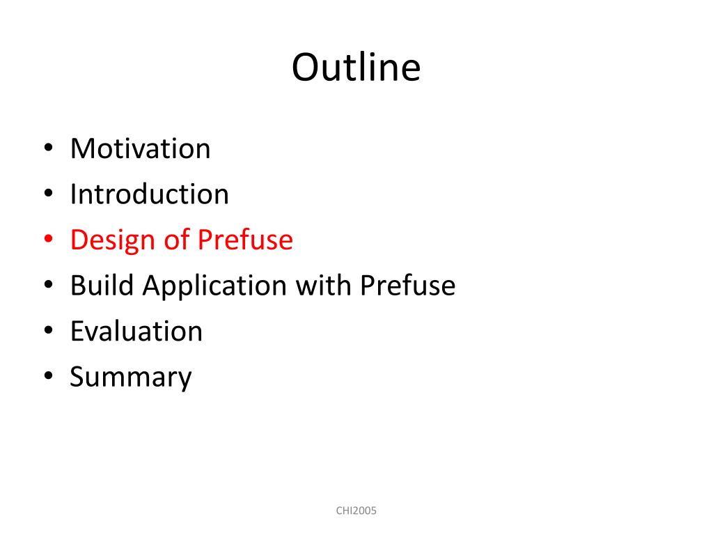 Outline • Motivation • Introduction • Design of Prefuse • Build Application with Prefuse • Evaluation • Summary CHI2005