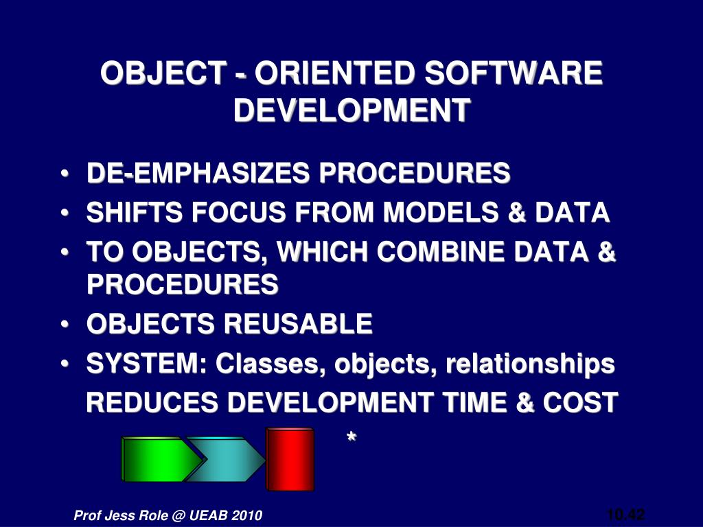 OBJECT - ORIENTED SOFTWARE DEVELOPMENT • DE-EMPHASIZES PROCEDURES • SHIFTS FOCUS FROM MODELS & DATA • TO OBJECTS, WHICH COMBINE DATA & PROCEDURES • OBJECTS REUSABLE • SYSTEM: Classes, objects, relationships REDUCES DEVELOPMENT TIME & COST *