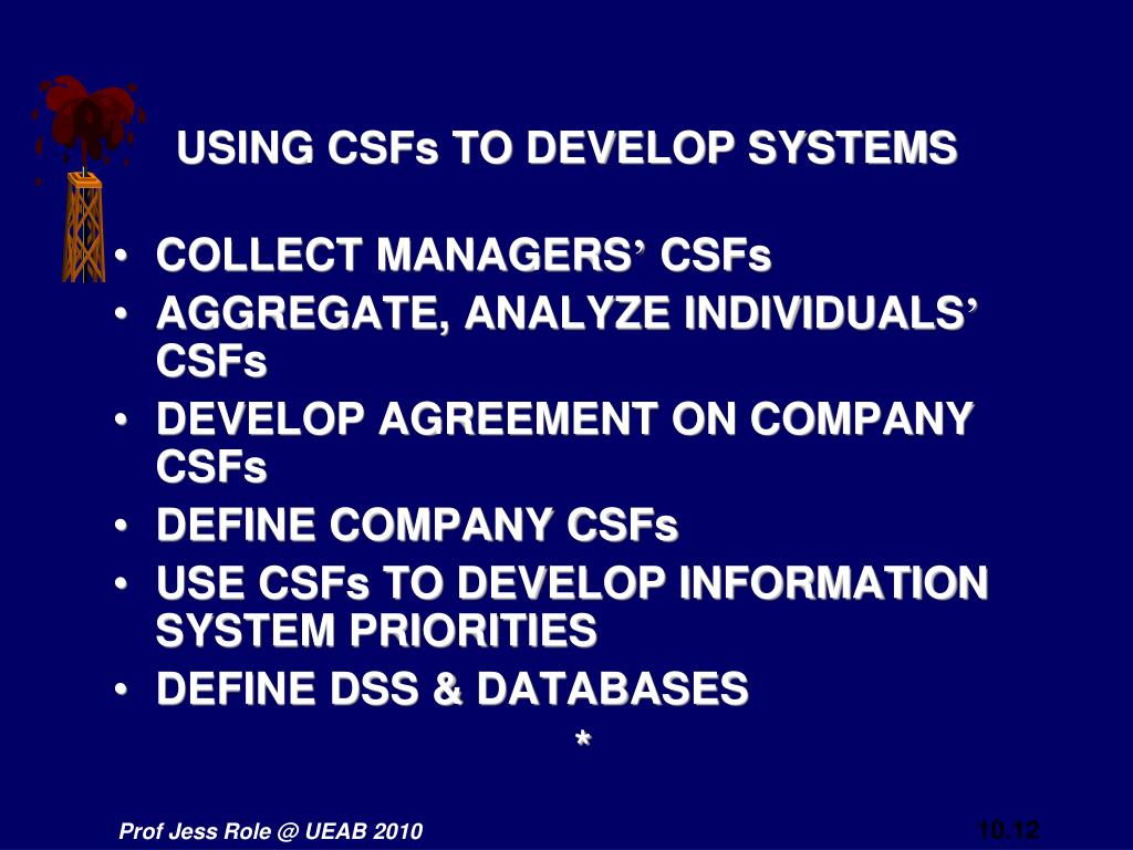 USING CSFs TO DEVELOP SYSTEMS • COLLECT MANAGERS’ CSFs • AGGREGATE, ANALYZE INDIVIDUALS’ CSFs • DEVELOP AGREEMENT ON COMPANY CSFs • DEFINE COMPANY CSFs • USE CSFs TO DEVELOP INFORMATION SYSTEM PRIORITIES • DEFINE DSS & DATABASES *