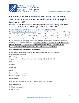 https://exactitudeconsultancy.com/ Corporate Wellness Solutions Market Trends 2022 Growth, Size, Segmentation, Future Demands, Innovation by Regional Forecast to 2029 Growth of Corporate Wellness Solutions Market are scheduled to accelerate at a high CAGR of 9% to reach above 120.32 USD billion by 2029 during Forecast Period from 2022 to 2029. Corporate Wellness Solutions Market Overview 2022 to 2029: This Corporate Wellness Solutions market research report discusses the key drivers influencing Information Technology & Telecommunication / Software & Enterprise Computing market growth, opportunities, the challenges and the risks faced by key players and the market as a whole. The Research study also analyses key emerging trends and their impact on present and future development. Major Eminent players making significant moves in the global market have earned their reputation by launching various strategies and profiting: ComPsych Corporation, LifeWorks, Inc., UnitedHealth Group (Optum), Anthem, Inc., Workplace Options, Cerner Corporation, Centene Corporation, TELUS, Cleveland Clinic, Wellright, Virgin Group Ltd., CVS Health Corporation and others. View Sample Research Report before Purchase Here: https://exactitudeconsultancy.com/reports/7819/corporate-wellness-solutions- market/#request-a-sample Market Segmentation: Corporate Wellness Solutions Market by Service Offering, 2020-2029, (USD Million) HRA Nutrition Weight Loss Fitness Substance Abuse Management Employee Assistance Programs Health Benefits Corporate Wellness Solutions Market by End User, 2020-2029, (USD Million) Large Organizations Mid-Sized Organizations SME Organizations 1 Ameliorate Digital Consultancy Private Ltd.