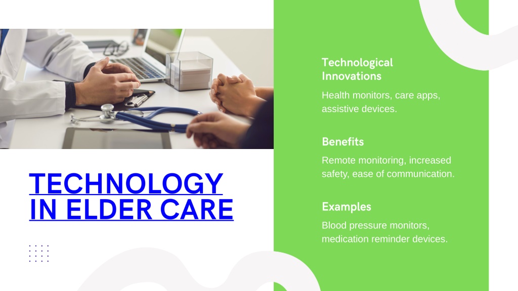 Technological Innovations Health monitors, care apps, assistive devices. Benefits Remote monitoring, increased safety, ease of communication. TECHNOLOGY IN ELDER CARE Examples Blood pressure monitors, medication reminder devices.