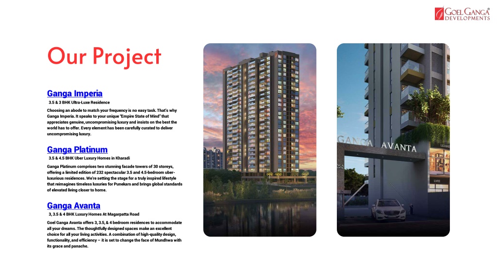 Our Project Ganga Imperia 3.5 & 3 BHK Ultra-Luxe Residence Choosing an abode to match your frequency is no easy task. That’s why Ganga Imperia. It speaks to your unique “Empire State of Mind” that appreciates genuine, uncompromising luxury and insists on the best the world has to offer. Every element has been carefully curated to deliver uncompromising luxury. Ganga Platinum 3.5 & 4.5 BHK Uber Luxury Homes in Kharadi Ganga Platinum comprises two stunning facade towers of 30 storeys, offering a limited edition of 232 spectacular 3.5 and 4.5-bedroom uber-luxurious residences. We’re setting the stage for a truly inspired lifestyle that reimagines timeless luxuries for Punekars and brings global standards of elevated living closer to home. Ganga Avanta 3, 3.5 & 4 BHK Luxury Homes At Magarpatta Road Goel Ganga Avanta offers 3, 3.5, & 4 bedroom residences to accommodate all your dreams. The thoughtfully designed spaces make an excellent choice for all your living activities. A combination of high-quality design, functionality, and efficiency – it is set to change the face of Mundhwa with its grace and panache.