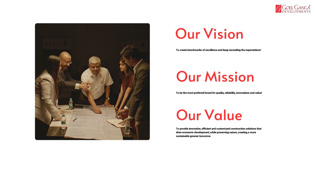 Our Vision To create benchmarks of excellence and keep exceeding the expectations! Our Mission To be the most preferred brand for quality, reliability, innovations and value! Our Value To provide innovative, efficient and customized construction solutions that drive economic development, while preserving nature, creating a more sustainable greener tomorrow.