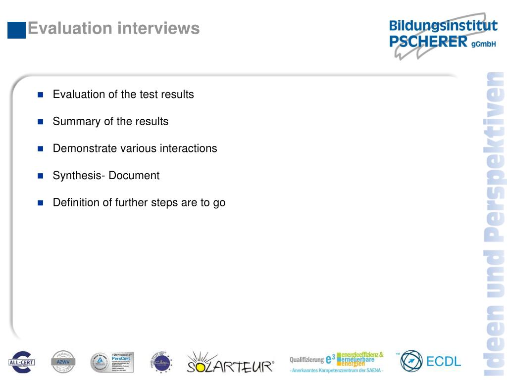 Evaluation interviews • Evaluation of the test results • Summary of the results • Demonstrate various interactions • Synthesis- Document • Definition of further steps are to go