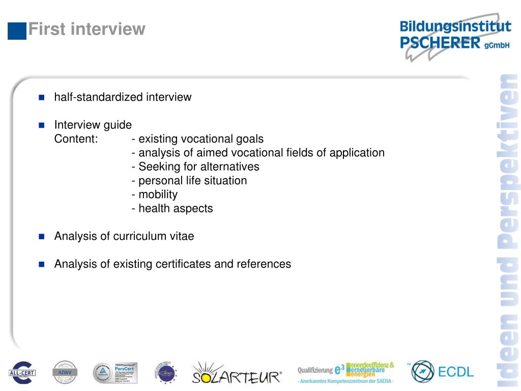 First interview • half-standardized interview • Interview guideContent: - existing vocational goals - analysis of aimed vocational fields of application - Seeking for alternatives - personal life situation - mobility - health aspects • Analysis of curriculum vitae • Analysis of existing certificates and references