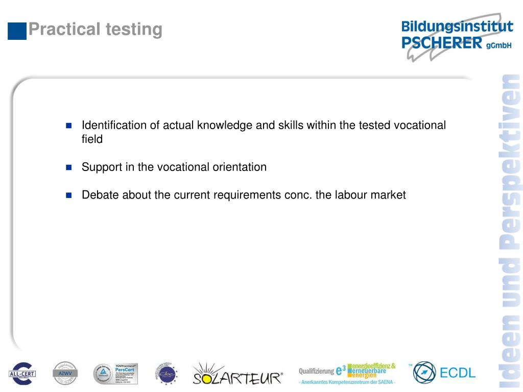 Practical testing • Identification of actual knowledge and skills within the tested vocational field • Support in the vocational orientation • Debate about the current requirements conc. the labour market