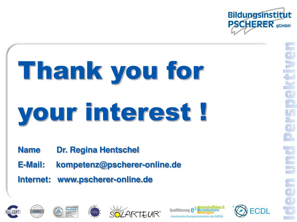 Thank you for your interest ! Name Dr. Regina Hentschel E-Mail: kompetenz@pscherer-online.de Internet: www.pscherer-online.de