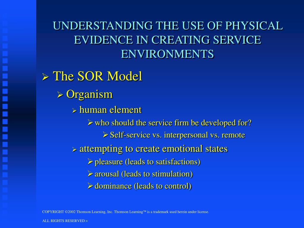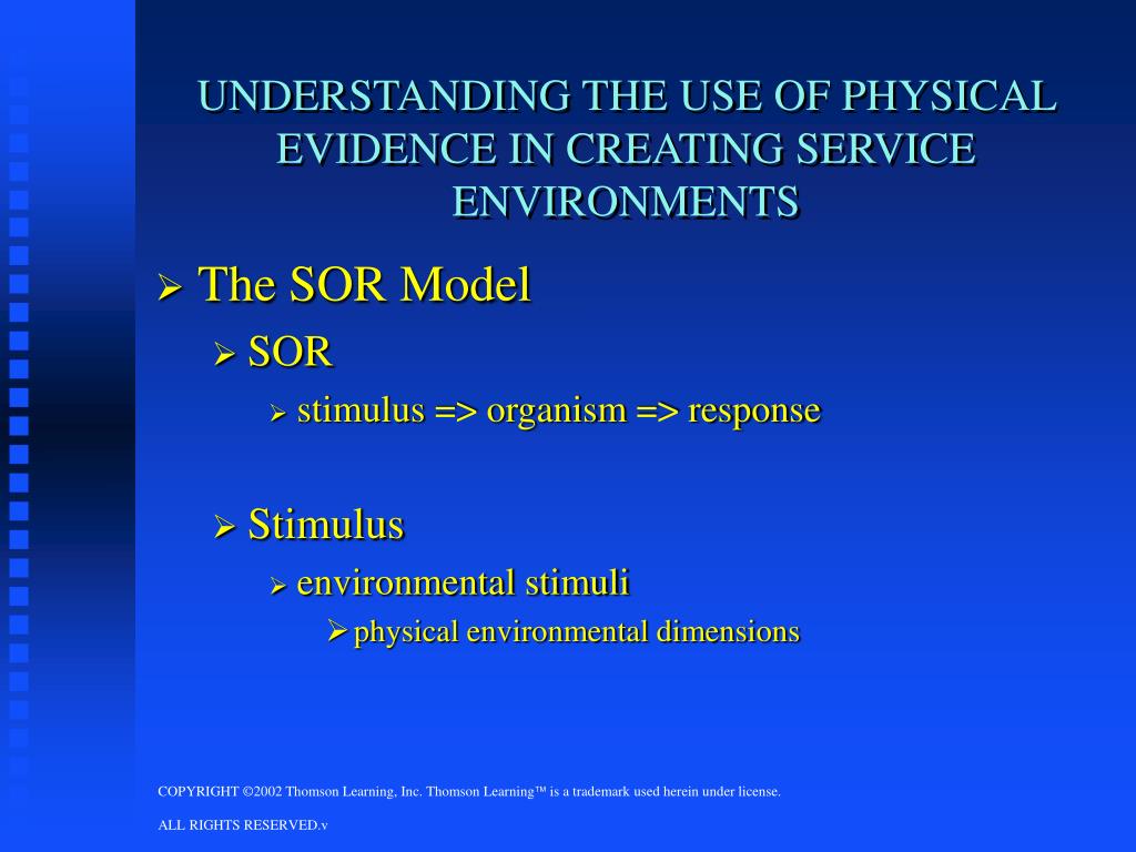 UNDERSTANDING THE USE OF PHYSICAL EVIDENCE IN CREATING SERVICE ENVIRONMENTS • The SOR Model • SOR • stimulus => organism => response • Stimulus • environmental stimuli • physical environmental dimensions