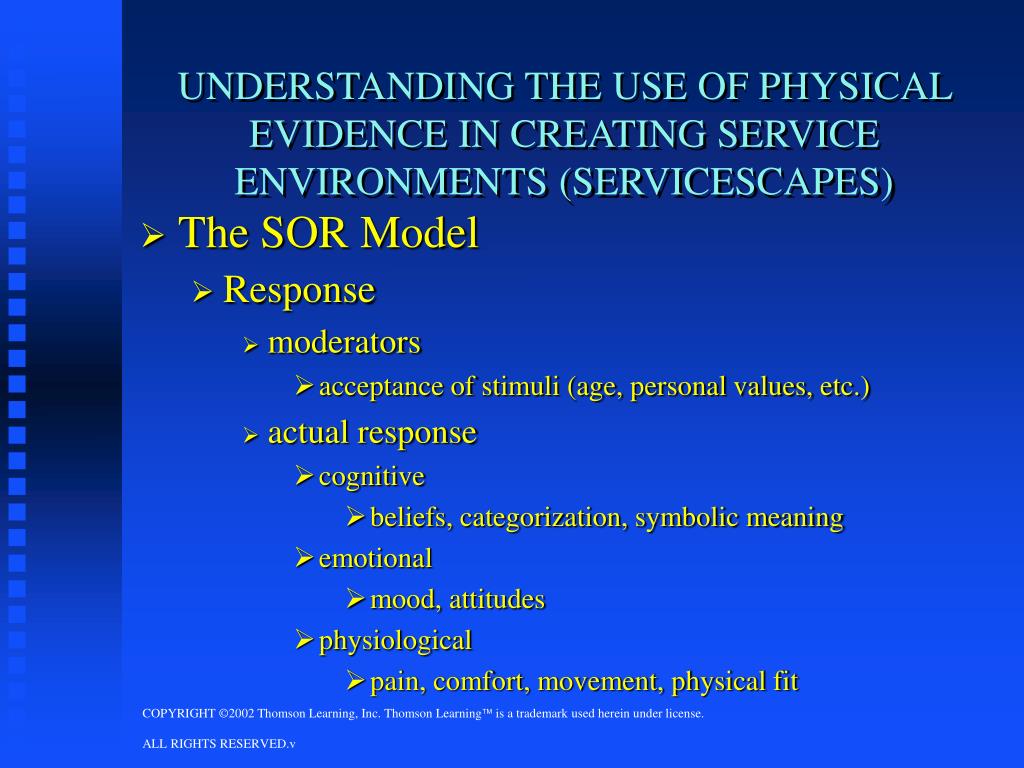 UNDERSTANDING THE USE OF PHYSICAL EVIDENCE IN CREATING SERVICE ENVIRONMENTS (SERVICESCAPES) • The SOR Model • Response • moderators • acceptance of stimuli (age, personal values, etc.) • actual response • cognitive • beliefs, categorization, symbolic meaning • emotional • mood, attitudes • physiological • pain, comfort, movement, physical fit