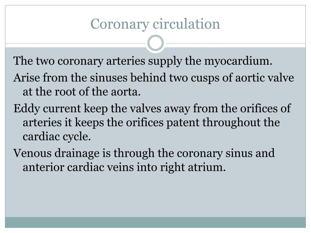 Coronary circulation The two coronary arteries supply the myocardium. Arise from the sinuses behind two cusps of aortic valve at the root of the aorta. Eddy current keep the valves away from the orifices of arteries it keeps the orifices patent throughout the cardiac cycle. Venous drainage is through the coronary sinus and anterior cardiac veins into right atrium.