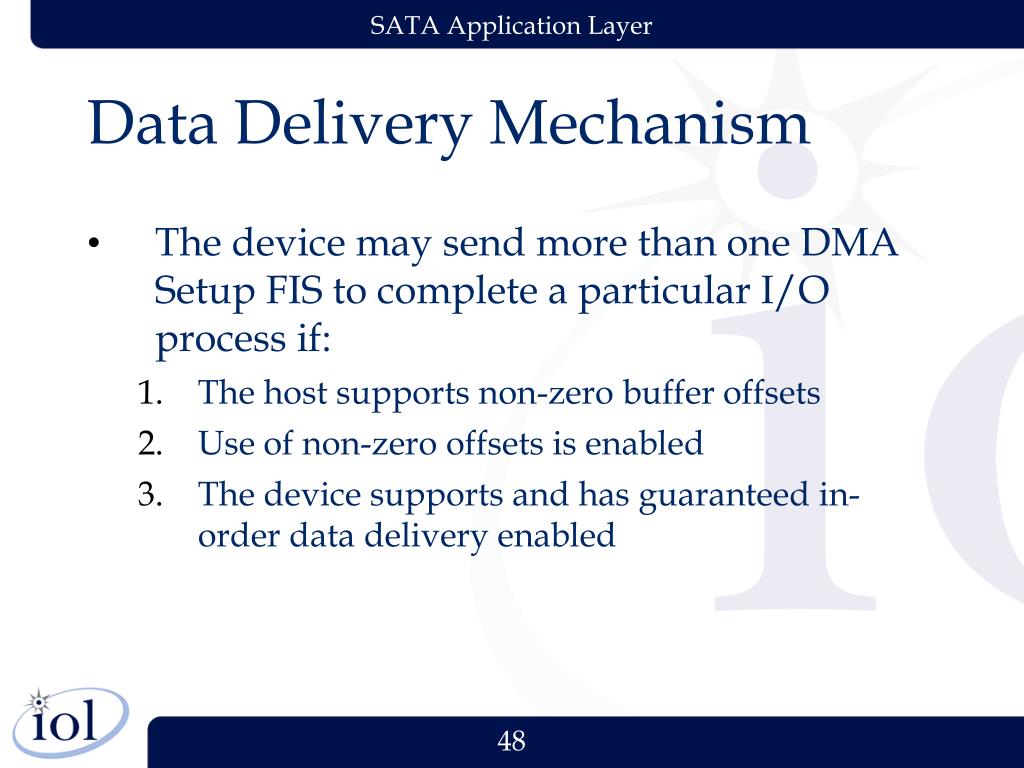 Data Delivery Mechanism • The device may send more than one DMA Setup FIS to complete a particular I/O process if: • The host supports non-zero buffer offsets • Use of non-zero offsets is enabled • The device supports and has guaranteed in-order data delivery enabled