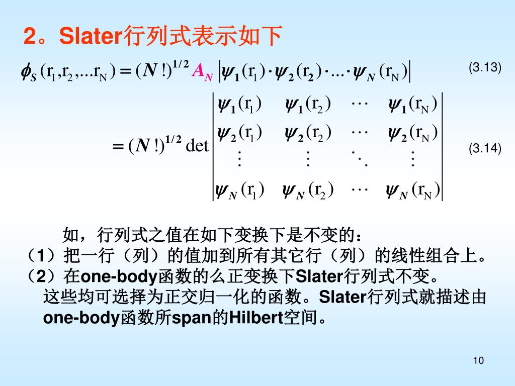 (3.13) 2。Slater行列式表示如下 (3.14) 如,行列式之值在如下变换下是不变的: (1)把一行(列)的值加到所有其它行(列)的线性组合上。 (2)在one-body函数的么正变换下Slater行列式不变。 这些均可选择为正交归一化的函数。Slater行列式就描述由 one-body函数所span的Hilbert空间。