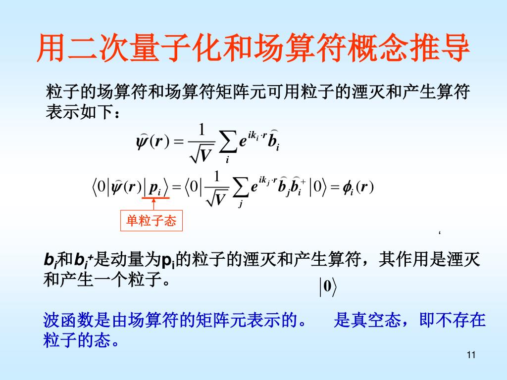 用二次量子化和场算符概念推导 粒子的场算符和场算符矩阵元可用粒子的湮灭和产生算符 表示如下: 单粒子态 ‘ bi和bi+是动量为pi的粒子的湮灭和产生算符,其作用是湮灭 和产生一个粒子。 波函数是由场算符的矩阵元表示的。 是真空态,即不存在 粒子的态。